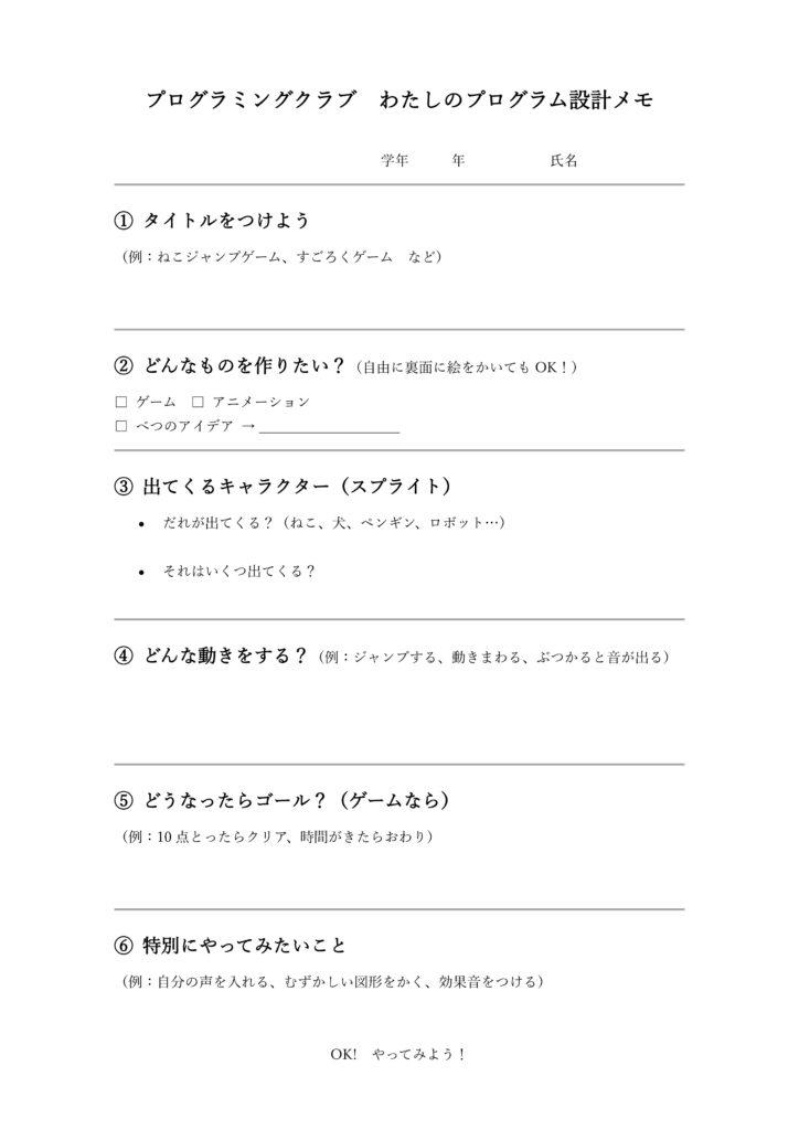 設計メモを配ると、子どもたちの顔には「えー、早くスクラッチでプログラミングしたい」という気持ちがありありと出ていました。